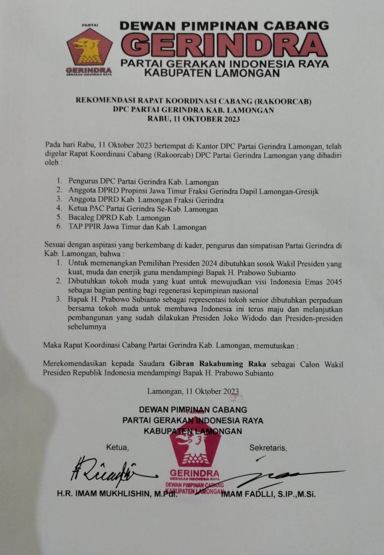Dihadiri seluruh pengurus DPC, PAC se-Kabupaten Lamongan, anggota DPRD Provinsi Jawa Timur Dapil X (Lamongan-Gresik) fraksi Gerindra, anggota DPRD Kabupaten Lamongan fraksi Gerindra, Bakal Calon Legislatif (Bacaleg) Gerindra, Ketua Tim Aksi Politik Purnawirawan Pejuang Indonesia Raya (TAP PPIR), rapat siang itu menyepakati dukungan kepada Gibran Rakabuming Raka untuk menjadi Calon Wakil Presiden mendampingi Prabowo Subianto.