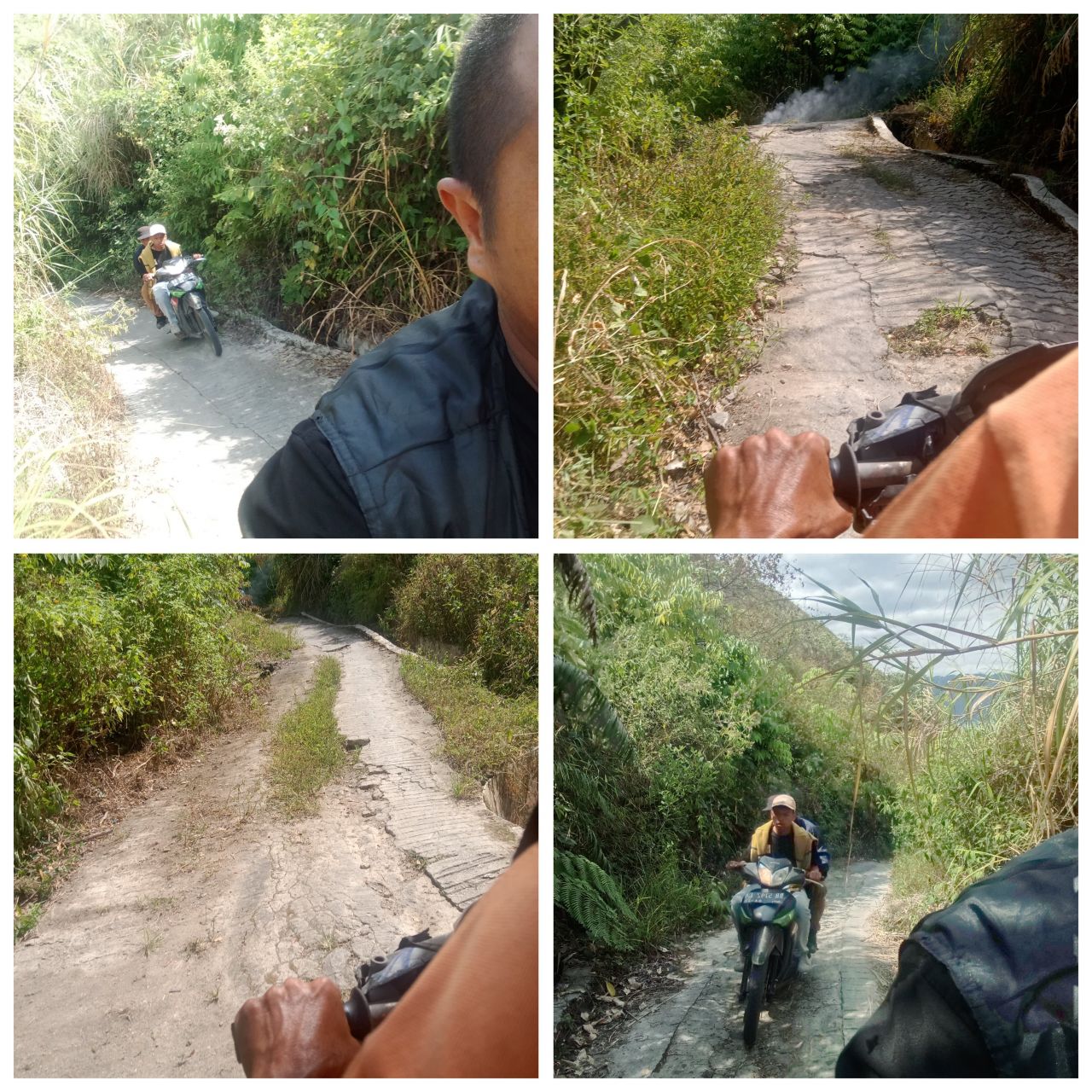 Jalan yang lebarnya kurang lebih 2 Meter menuju desa tersebut juga rusak dan ber tikungan, degan kemiringan yang sangat curam sangat beresiko bagi masyarakat saat melintasi jalan desa tersebut, utamanya tidak ada penerangan lampu jalan pada saat malam hari.
