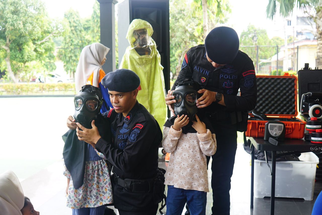 Kegiatan berlangsung penuh keceriaan dan semangat. Anak-anak tampak antusias mengikuti berbagai sesi pengenalan peralatan Brimob, simulasi sederhana, serta berfoto bersama personel dan kendaraan taktis Brimob.