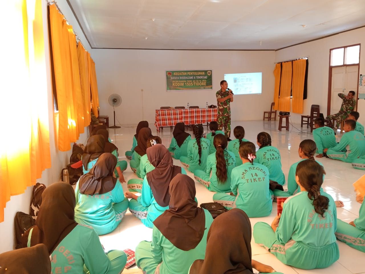 Kegiatan penyuluhan ini menghadirkan narasumber Kasdim 1505/Tidore Mayor Inf Asihno yang memberikan pemahaman kepada para siswa tentang pentingnya menjaga semangat nasionalisme, menolak paham-paham yang bertentangan dengan ideologi Pancasila, serta meningkatkan kewaspadaan terhadap potensi penyebaran paham radikal di lingkungan sekolah maupun masyarakat.