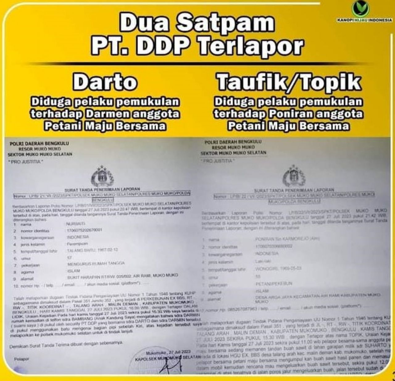 KABUPATEN MUKOMUKO (Beritakeadilan, Bengkulu)-Kedua oknum satuan pengamanan (satpam) PT. Daria Dharma Pratama (DDP) diduga memukul 2 (dua) anggota Petani Maju Bersama, Malin Deman, Kabupaten Mukomuko, Bengkulu, Kamis (27/07/2023).