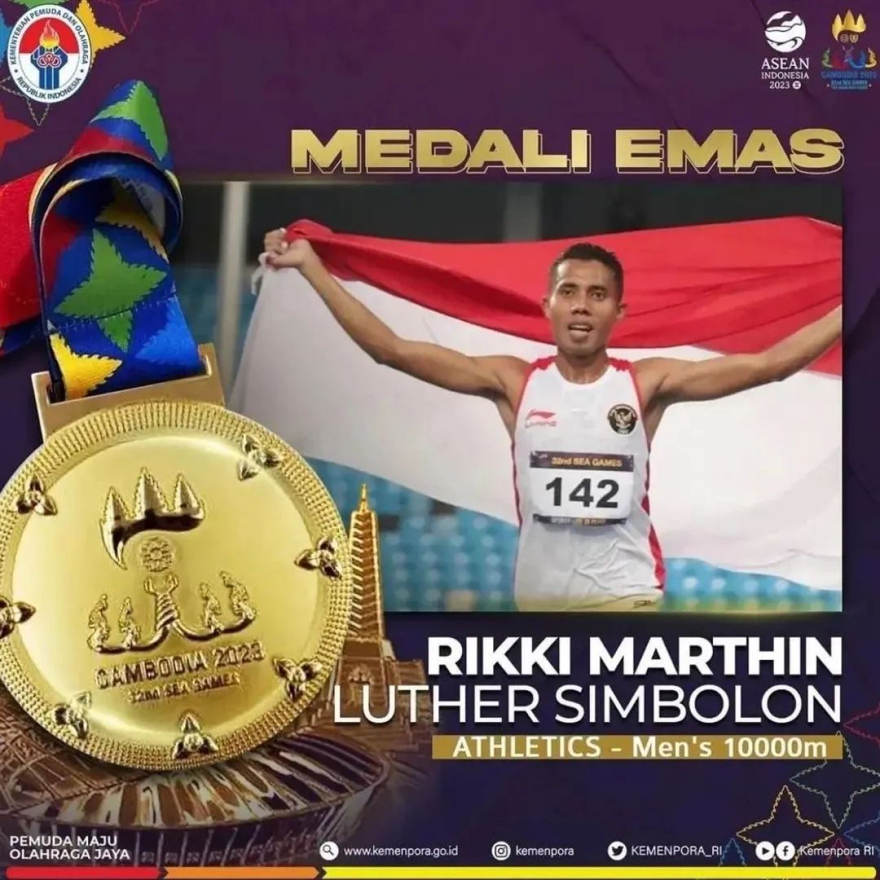 KAMBOJA (Beritakeadilan,Kamboja) – Atlet lari Batalyon Zeni Tempur (Yon Zipur) 9/Lang Lang Bhuwana Divisi Infanteri (Divif) 1 Kostrad Praka Rikki Marthin Luther Simbolon dari cabang olahraga Atletik yang berhasil mempersembahkan medali emas bagi Indonesia di nomor Men’s 10.000m dalam event SEA Games 2023 yang digelar di Morodok Techno National Stadium Kamboja. Kamis (11/05/2023).