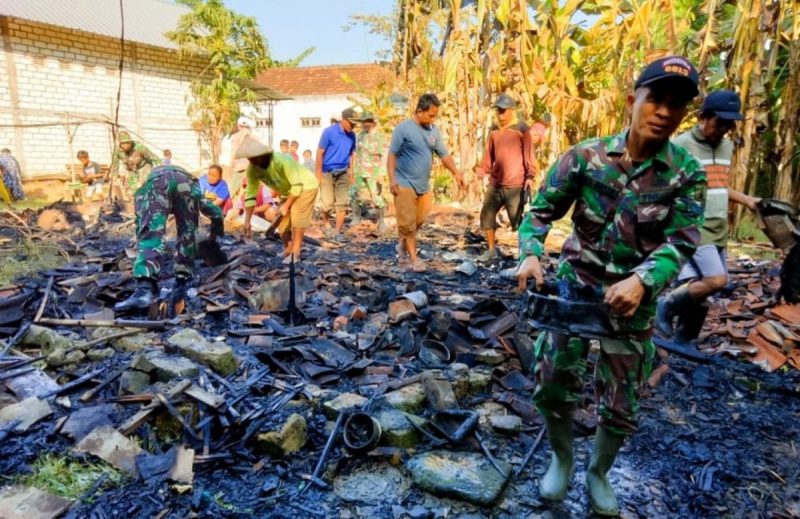 Puing-puing sisa kebakaran nampak berserakan, mulai dari pagi dibersihkan oleh anggota TNI bersama warga masyarakat sekitar. Kebakaran ini, disebabkan dari tungku kayu bakar yang digunakan untuk memasak ditinggal pergi oleh Mbah Kamah.