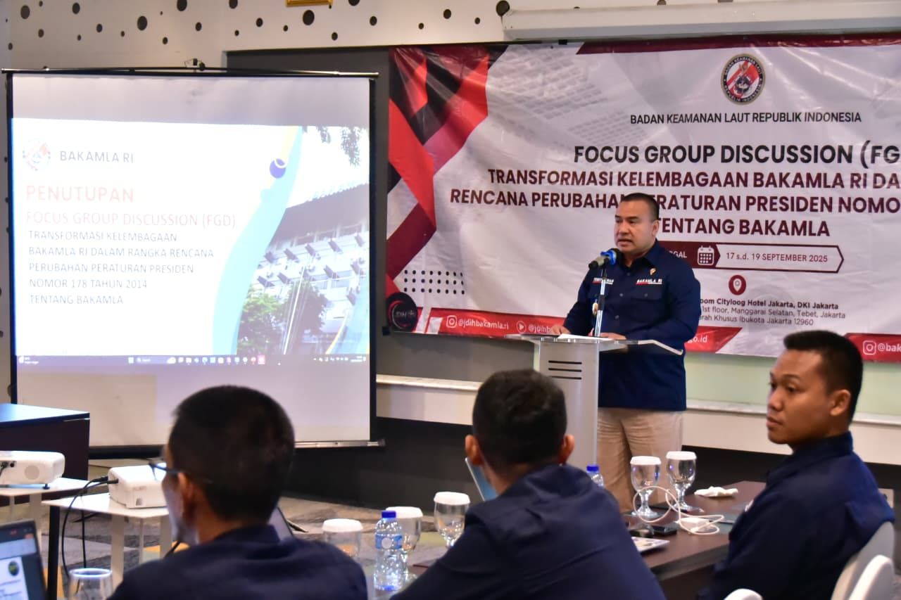 JAKARTA PUSAT (Beritakeadilan.com, DK Jakarta) Bakamla RI/Indonesia Coast Guard — Bakamla RI resmi menutup rangkaian kegiatan Focus Group Discussion (FGD) Transformasi Kelembagaan Bakamla RI dalam Rencana Perubahan Peraturan Presiden Nomor 178 Tahun 2014 tentang Bakamla. Acara penutupan dipimpin oleh Direktur Hukum Bakamla RI, Laksma Bakamla Fenny Akwan, S.H., M.H. di Jakarta, Jumat (19/9/2025).