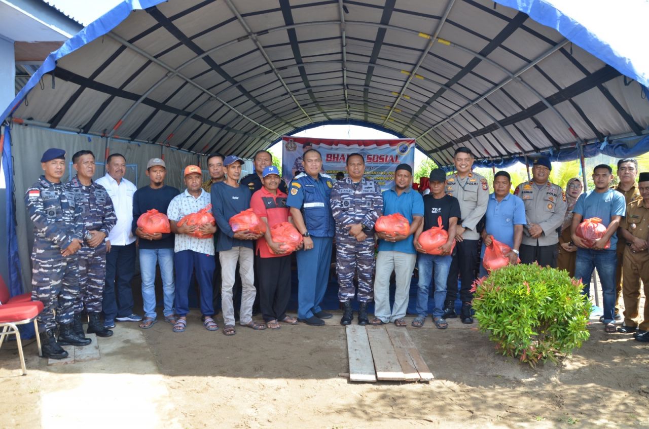 Pada kesempatan itu pula, Danlanal Dumai didampingi Unsur Maritim yang berada di Kabupaten Inhil melaksanakan Bakti Sosial peduli masyarakat pesisir dengan membagikan paket sembako untuk nelayan dan masyarakat disekitar Perairan Tembilahan.