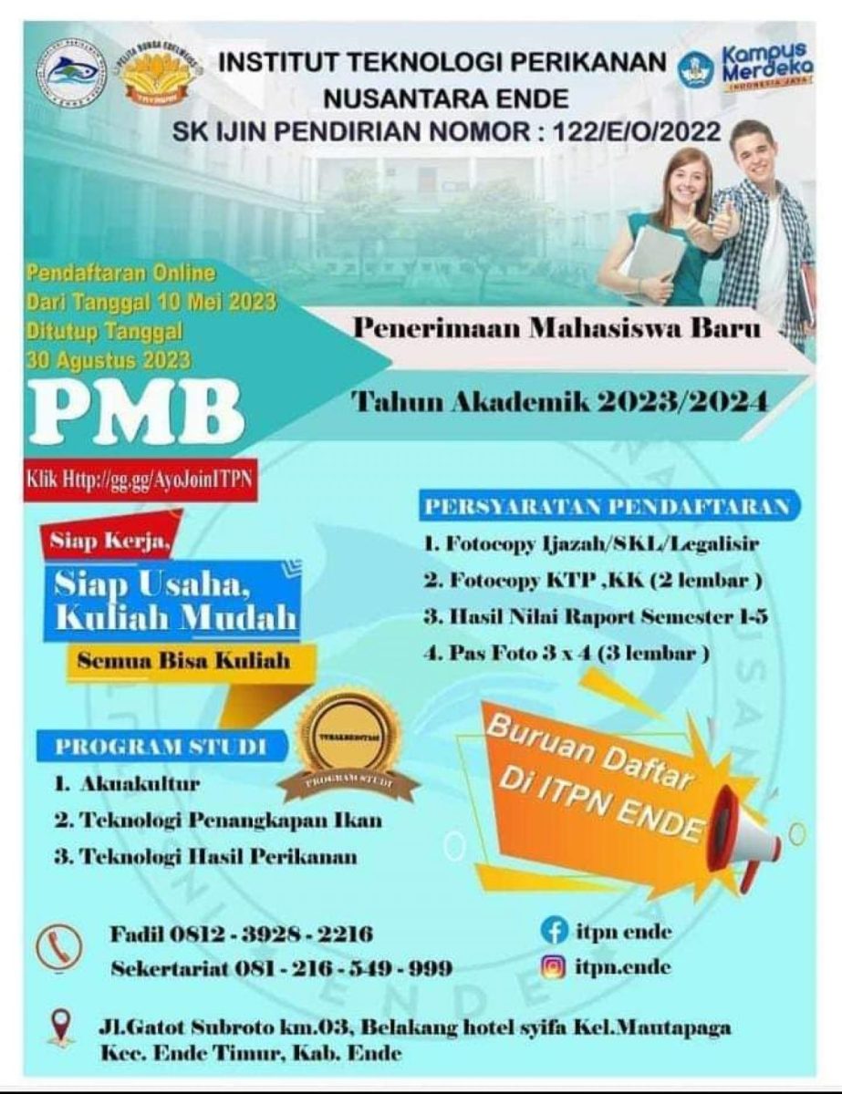 Mengenai lokasi pendaftaran, bisa langsung datang ke Sekretariat ITPN Ende, di Jalan Melati Atas Depan (Kantor Pertanahan) atau bisa datang langsung ke Kampus ITPN Ende di Jalan Gatot Subroto km 03, (Belakang Hotel Syifa) Kelurahan Mautapaga, Kecamatan Ende Timur, Kabupaten Ende. Untuk informasi bisa menghubungi nomor 0812 38282216/ 081216549999. (red)