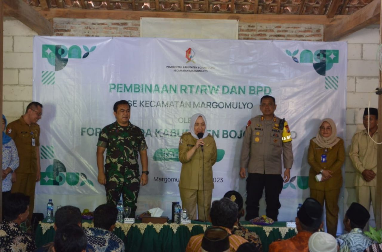 BOJONEGORO (Beritakeadilan, Jawa Timur) – Bupati Bojonegoro Anna Mu’awanah dan jajaran Forkopimda menghadiri acara pembinaan RT/RW dan BPD se-Kecamatan Margomulyo, Senin (22/5/2023). Acara digelar di rumah Lina Kader Posyandu Dusun Bungkul RT 4 RW 5 Desa Sumberjo Kecamatan Margomulyo. Acara diikuti sekitar 150 orang.