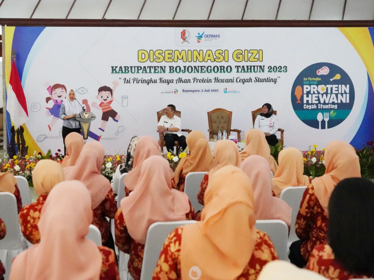 BOJONEGORO (Beritakeadilan, Jawa Timur) – Bupati Bojonegoro Anna Mu’awanah memastikan program pencegahan stunting harus tepat sasaran agar dapat menekan angka stunting setiap tahunnya. Penegasan ini disampaikan Bupati Anna dalam kegiatan diseminasi gizi kepada ibu PKK dan Dharma Wanita, serta para pekerja perempuan di Pendopo Malowopati Bojonegoro, Rabu (5/6/2023).