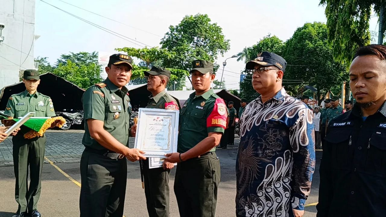 KOTA BEKASI (Beritakeadilan, Jawa Barat) – Dandim 0507/Bekasi Kolonel Kav Luluk Setyanto,M.P.M., pimpin upacara penyerahan penghargaan kepada Babinsa Kota Baru Koramil 01/Kranji Serka Muslih dan Sertu Ari Fatoni beserta Lurah Kota Baru Bapak Agus H Makmun dengan Pamor RW.04 Bapak Syarif yang bertempat di lapangan Makodim 0507/Bekasi, Jl Jend Sudirman, Kel.Kranji, Kec Bekasi Barat, Kota Bekasi. Kamis (4/5/2023).