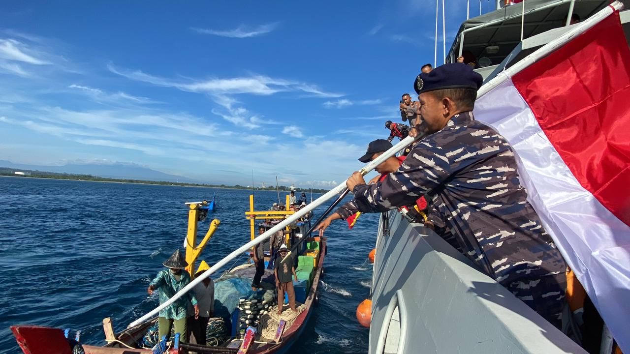Danlanal Beserta Pimpinan TNI-POLRI Lhokseumawe dan Aceh Utara Bagikan Bendera Merah Putih Kepada Nelayan di Laut
