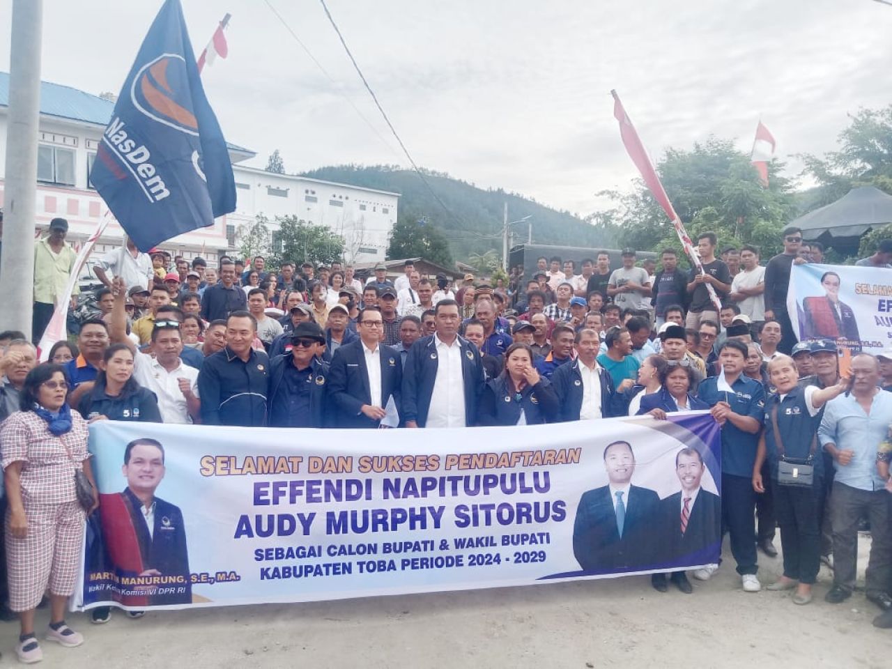 Kegiatan diawali dengan ” Arak-arakan pendukung Effendi Murphy” sepanjang Jalan lintas Sumatera dan memadati kompleks Rbo balige. Selanjutnya berlangsung Ibadah singkat yang dipimpin Pdt.B.Pardede dan berangkat ke KPU Toba. Tampak hadir mendampingi DPW Nasdem Sumatera utara, Ganda Manurung di dampingi Candrow manurung, Robinson Sibarani dan pengurus NasDem Toba.