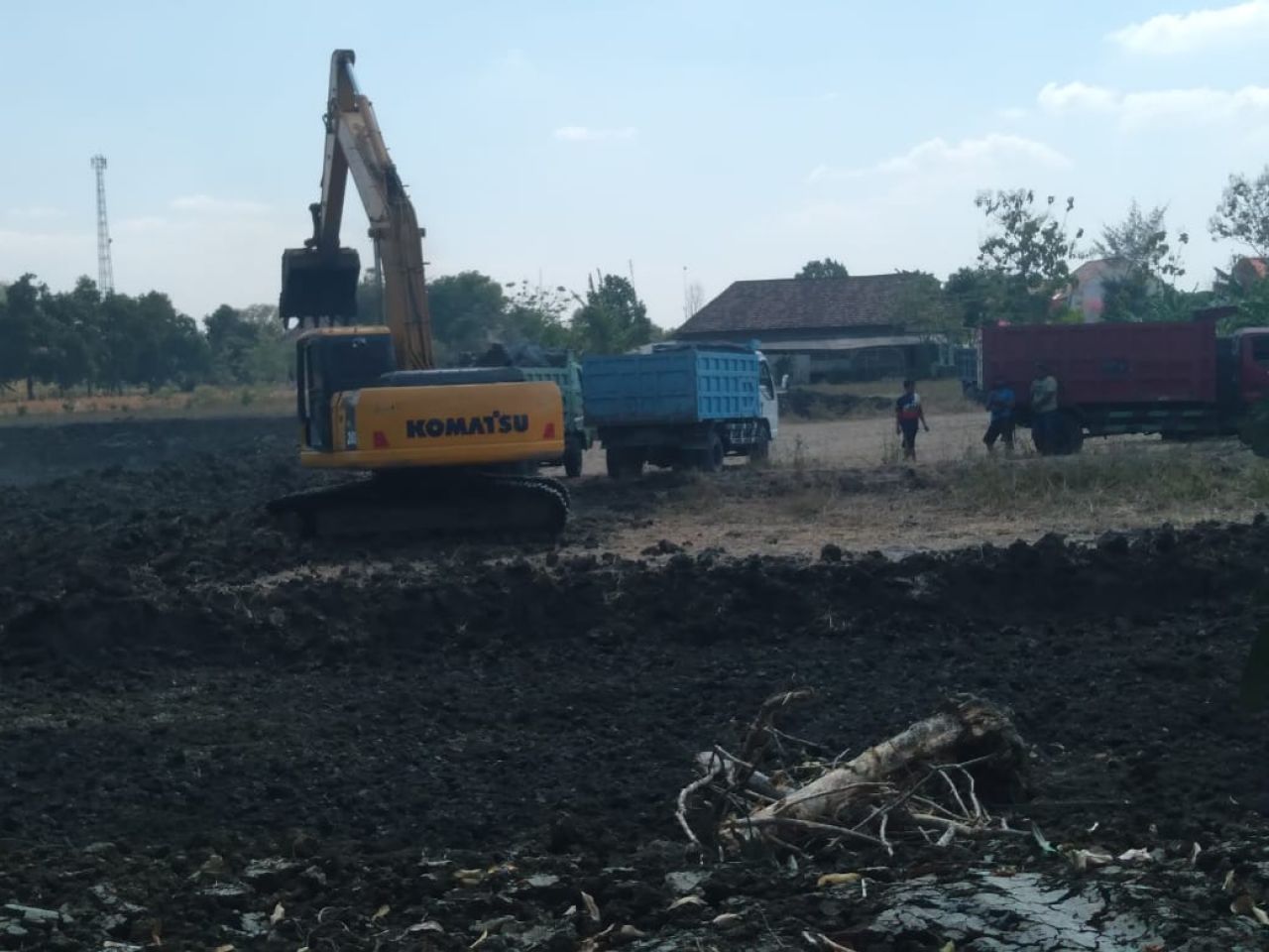 Kejari Lamongan saat tiba di lokasi pengerukan yang berada di depan Kantor Balai Desa Tlogoagung, aktivitas alat berat sudah tidak beroperasi lagi dan puluhan dump truk yang kemarin lalu lalang mengangkut tanah hasil kerukan juga tidak terlihat di lokasi.