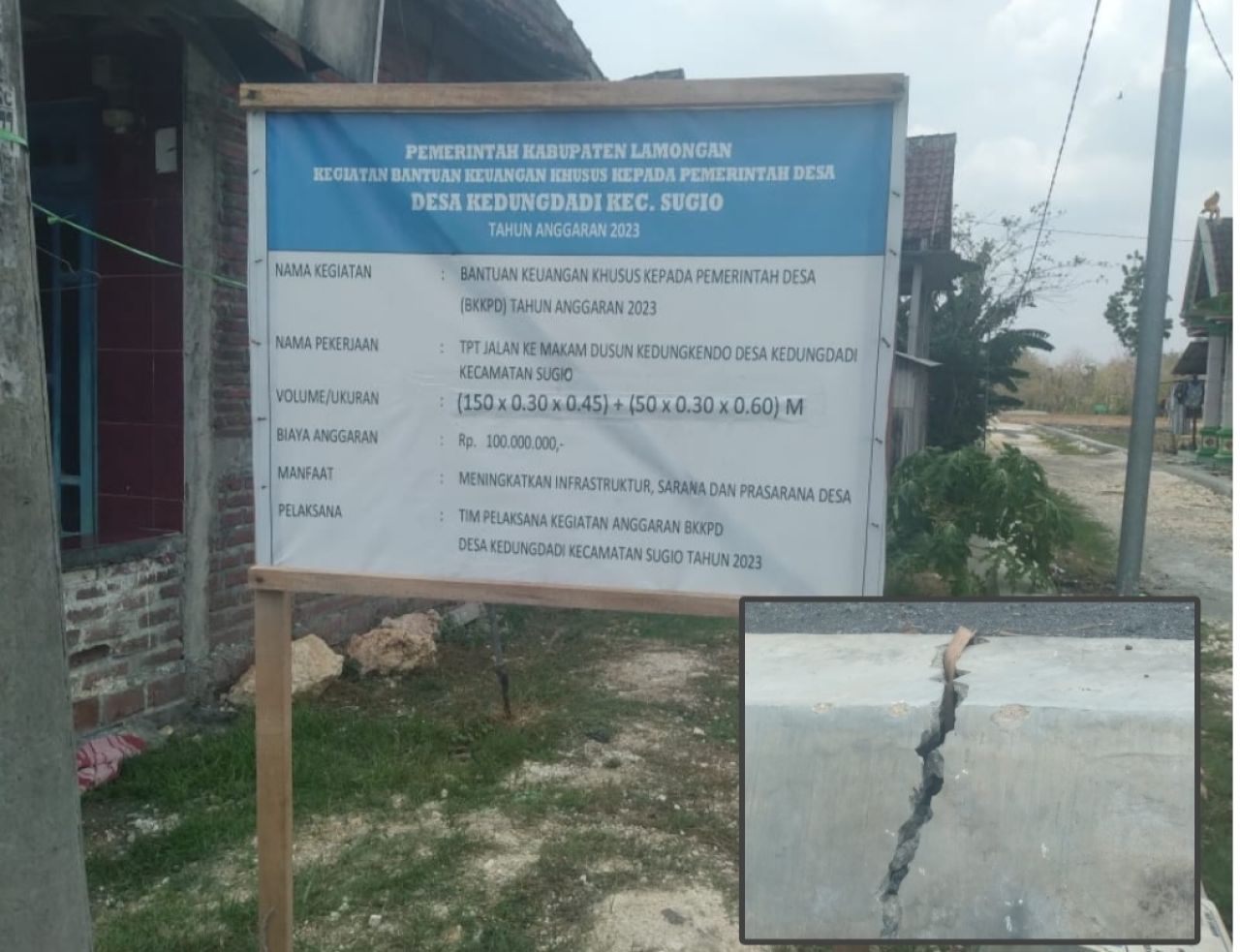 Lamongan (BeritaKeadilan, Jawa Timur)- Bangunan proyek Tembok Penahan Tanah ( TPT) dengan volume pekerjaan kurang lebih sekitar 200 meter, yang berada di Dusun Kedungkendo, Desa Kedungdadi, Kecamatan Segio, kini kondisinya pecah dan retak- retak, Senin (20/11/2023).