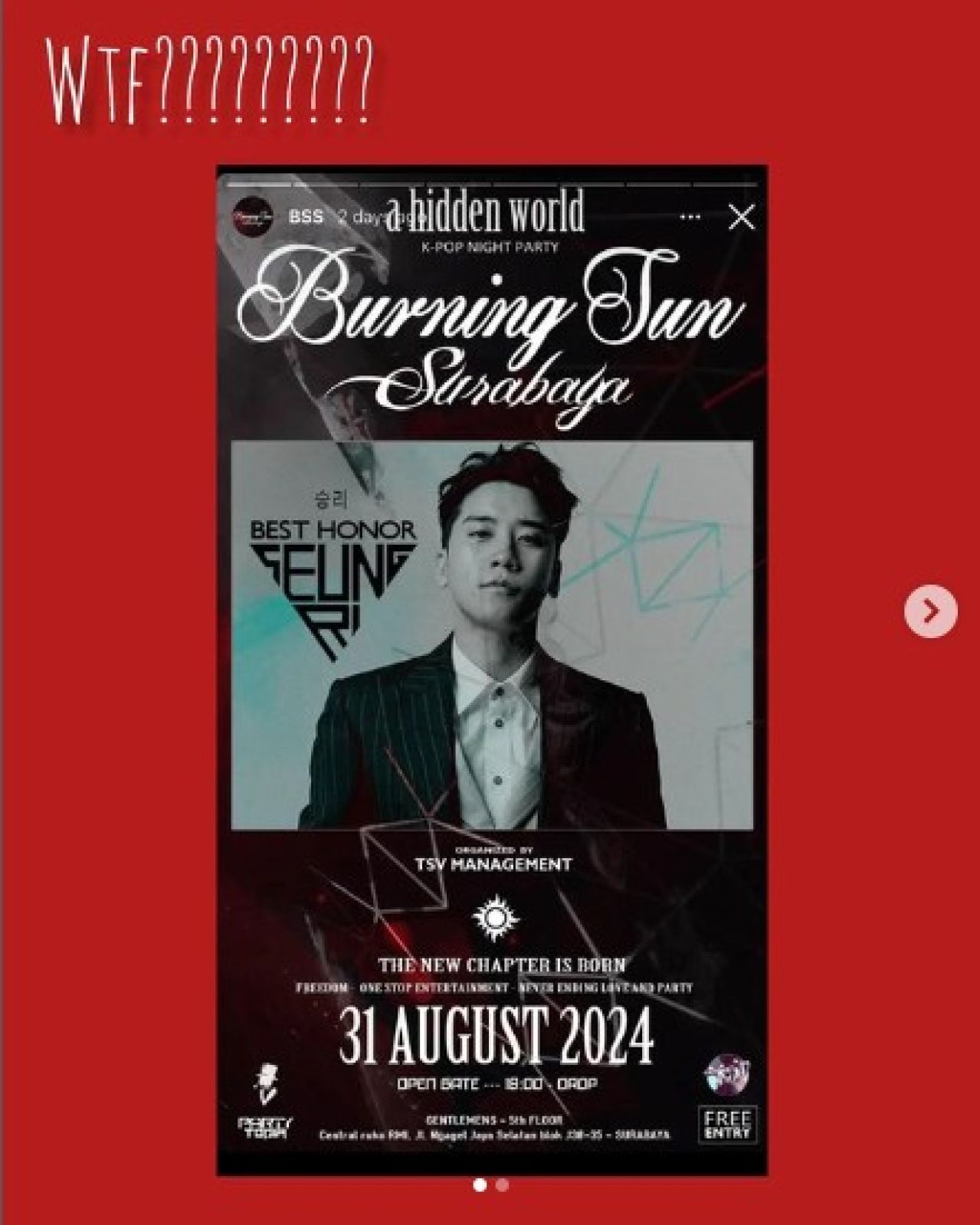 Masih di akun IG dunianeti, yang menyajikan Screenshot akun Twitter @tang_kira tertulis status bahwa, Seungri klarifikasi dia tidak tahu menahu soal event Burning Sun di Indonesia, bahkan Seungri gaktau itu daerah mana. Selengkapnya: