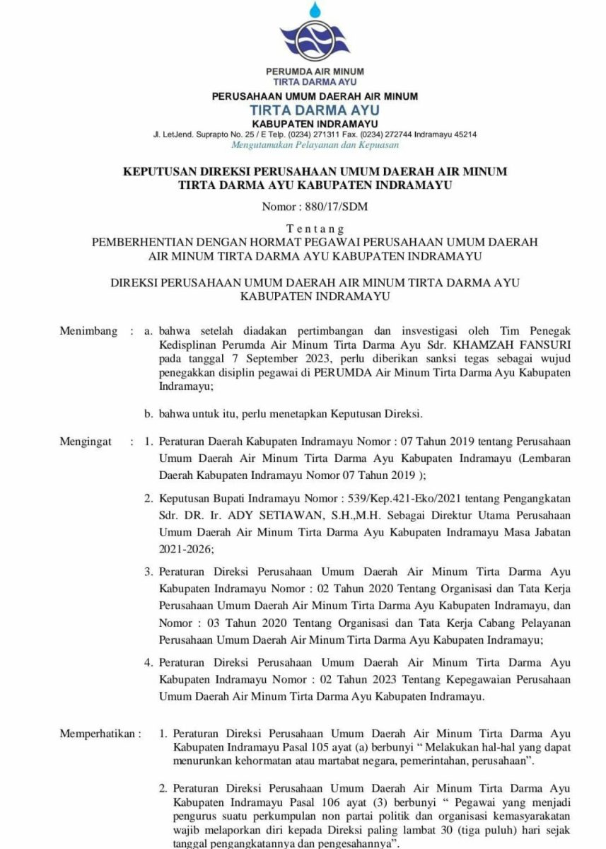Dalam surat itu menyebutkan sanksi tegas tersebut diberikan kepada Hamzah Fansuri yang bekerja di Perumdam Tirta Darma Ayu Kabupaten Indramayu sebagai staf di bagian hubungan pelanggan dan Kehumasan.