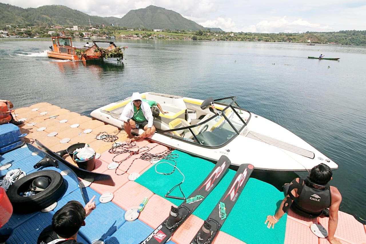 Dinas Lingkungan Hidup Kab.Toba bekerjasama dengan Team SAR , lakukan pembersihan ecenggondok yang menyebar di perairan Danau Toba. Tempat perlombaan Ski Air PON XXI Aceh – Sumut 2024 di Kab.Toba.