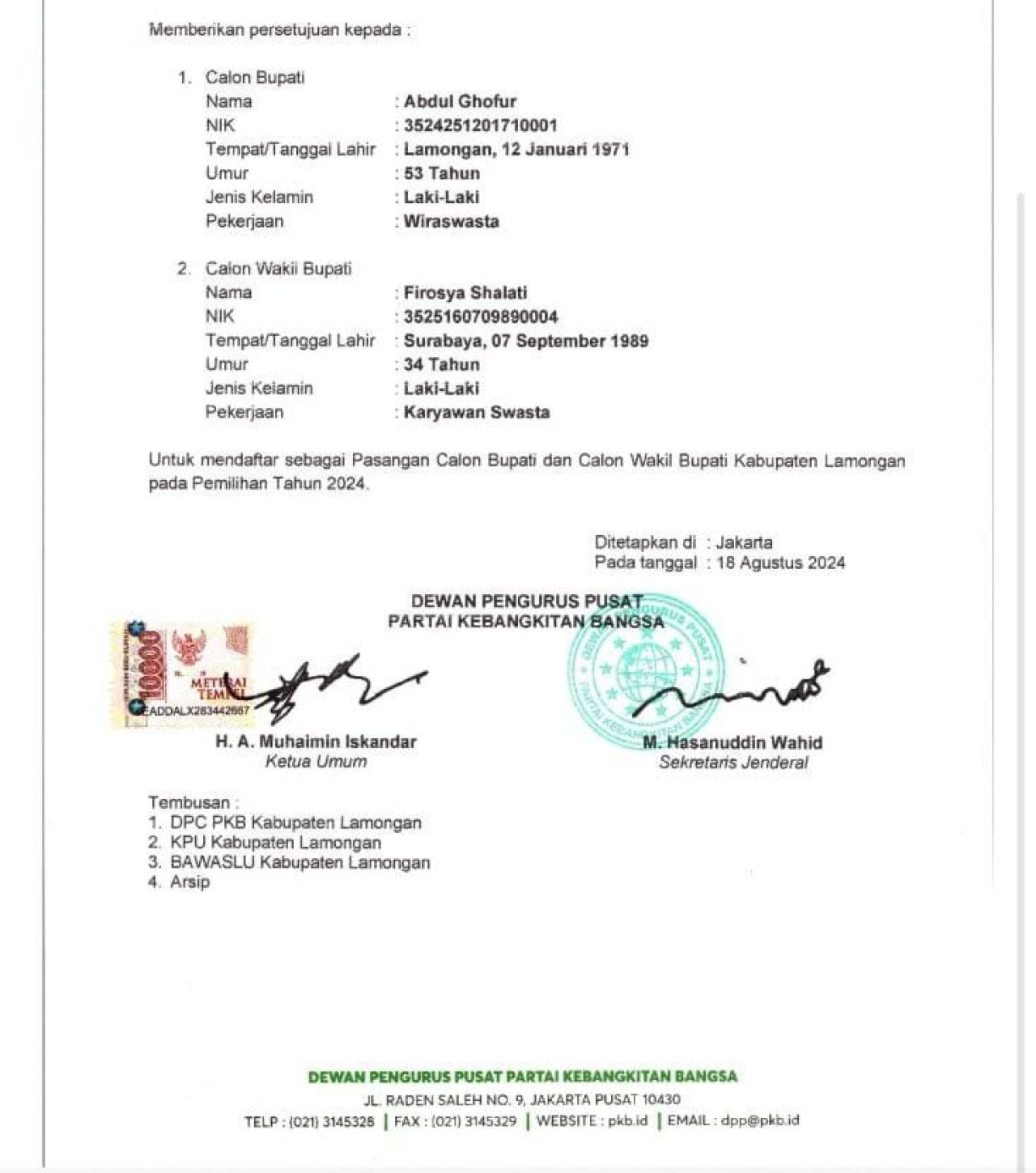Kepastian itu didapat setelah DPP PKB mengeluarkan surat keputusan bernomor 35743/DPP/01/VIII/2024 tentang Persetujuan Calon Bupati dan Wakil Bupati Kabupaten Lamongan Periode 2024-2029 untuk pasangan calon Abdul Ghofur – Firosya Shalati.