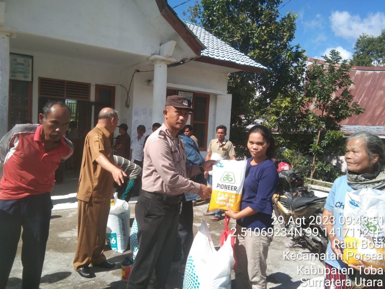 Turut hadir Camat Bonatua Lunasi P Panjaitan, Kades Lumban Sangkalan Antoni Sitorus, Pendamping Desa Artha Manurung, Babinsa Koramil Lumban Julu Serma D.Hutabarat, Bhabinkamtibmas Polsek Lumban Julu Bripka S.Siagian dan Masyarakat penerima bantuan. (Humas Polres Toba/Alex )