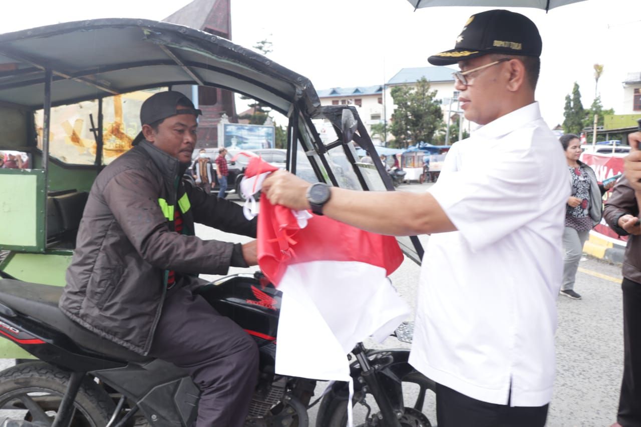 KABUPATEN TOBA (Beritakeadila, Sumatera Utara)- Di tengah gerimis menyirami Kota Balige, Forkopimda Kabupaten Toba tampak semangat dan antusias membagikan bendera bagi masyarakat dan para pengendara yang melintasi pusat kota Balige.