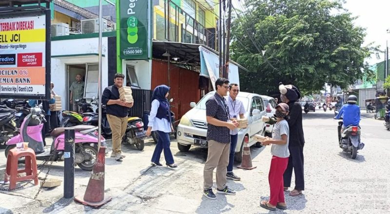 Para pegawai Pegadaian membagikan makanan siap saji kepada para masyarakat sekitar didepan Kantor Pegadaian CP Setia Mekar Bekasi