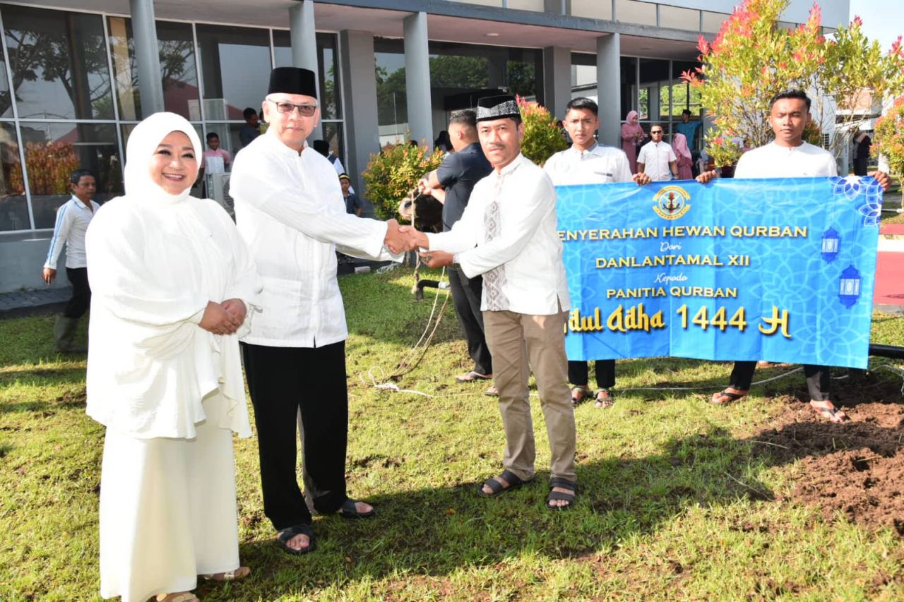 Pada peringatan Hari Raya Idul Adha 1444 Hijriah kali ini, Danlantamal XII secara simbolis menyerahkan hewan kurban sebanyak 8 ekor sapi dan 10 ekor kambing dari para pejabat Lantamal XII dan sohibul kurban kepada Ketua Panitia Kurban Letkol Laut (PM) Hendry Wijaya, S.H., yang akan memotong dan membagikannya kepada warga sekitar Lantamal XII yang membutuhkan.