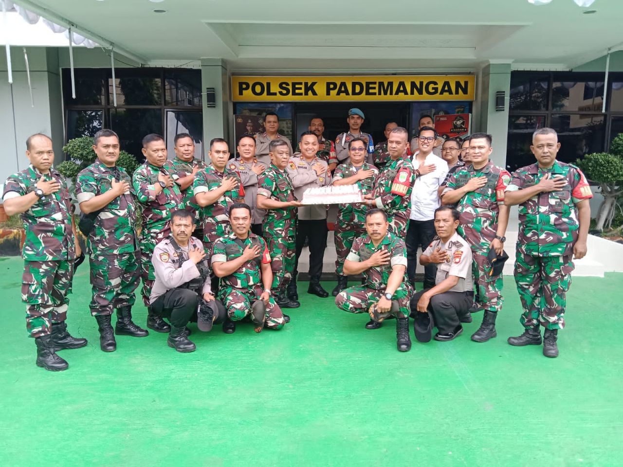 Selanjutnya Danramil memberikan kue ulang tahun yang diterima langsung oleh para Kapolsek dan anggota, dilanjutkan dengan foto bersama .