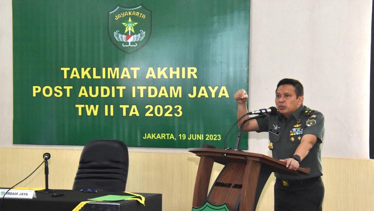 JAKARTA TIMUR (Beritakeadilan, DKI Jakarta) – Tim Post Audit Itdam Jaya yang dipimpin Irdam Jaya Brigjen TNI Dr. Triadi Murwanto, S.E., M.M., sampaikan Taklimat Akhir kepada seluruh pejabat Kabalakdam Jaya dan para Dansat Jajaran Kodam Jaya, bertempat di Aula Itdam Jaya Makodam Jaya. Senin (19/06/2023).
