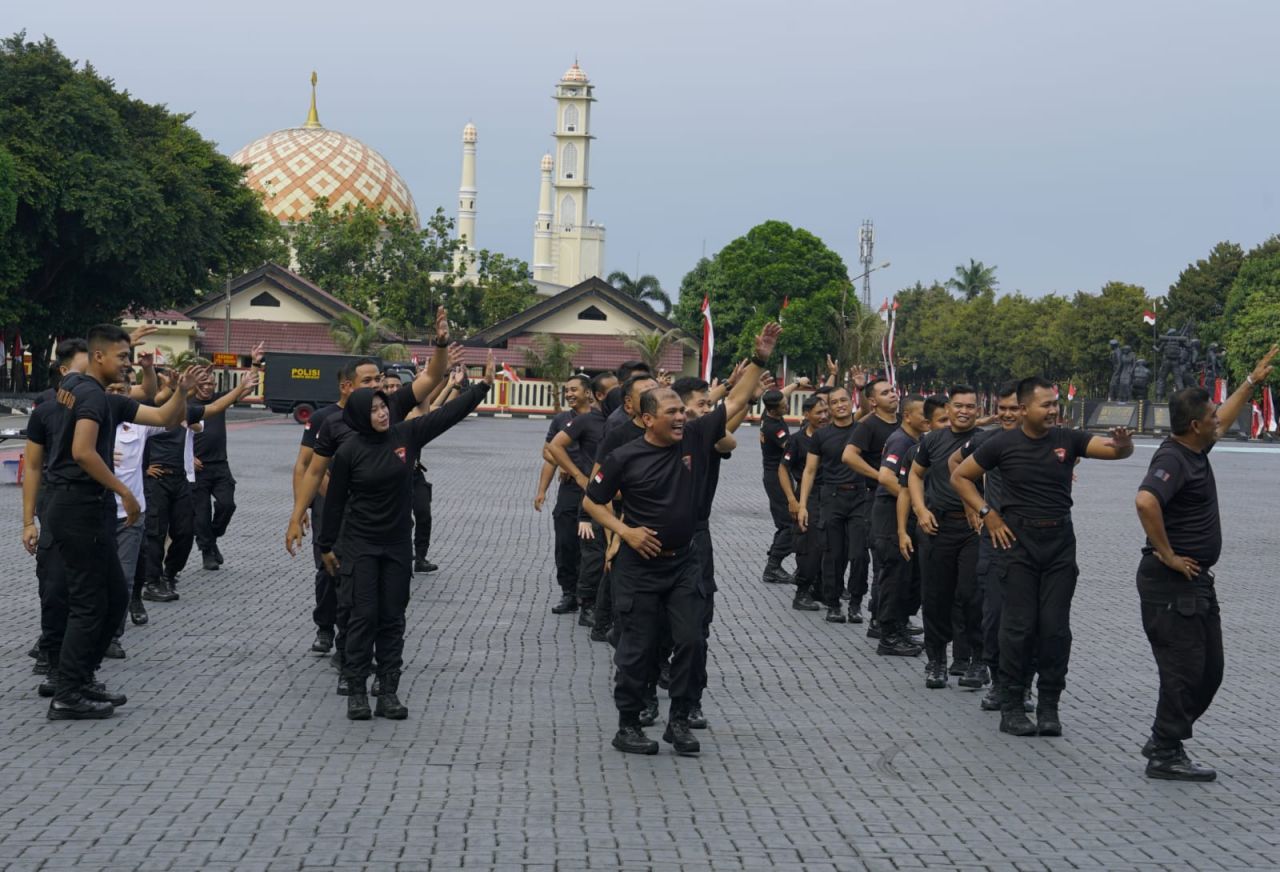 KOTA DEPOK (Beritakeadilan, Jawa Barat) – Usai kegiatan apel pagi personel staf Mako Brimob melaksanakan olahraga bersama dengan penuh semangat, energic dan bergoyang bersama, para personel mengikuti irama alunan musik tarian khas Bajawa dari NTT, yang di pandu langsung oleh polwan-polwan Brimob, Selasa (06/06/2023).