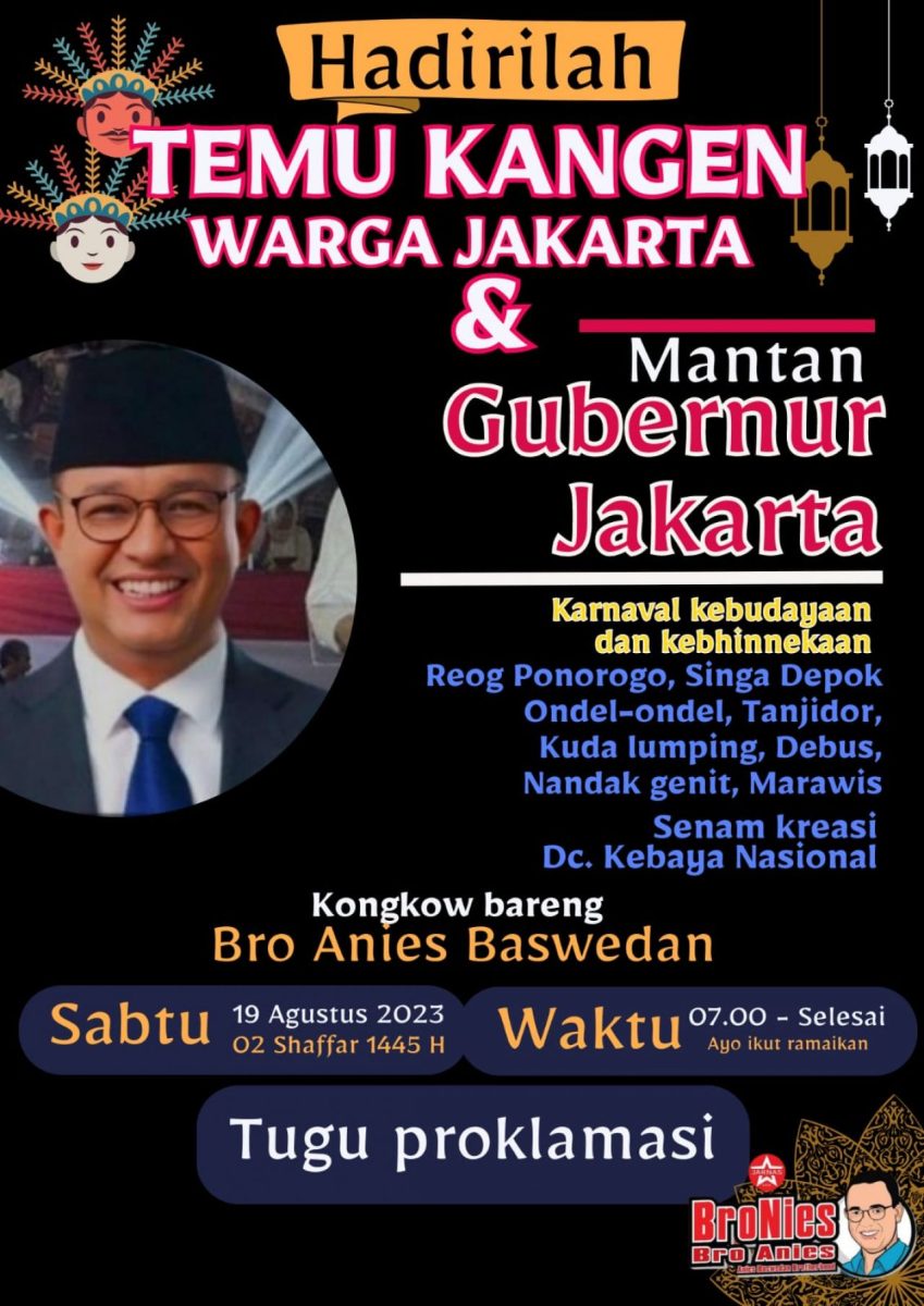 Sebagai bagian dari refleksi dan evaluasi kegetiran itu. *Dewan Pimpinan Wilayah (DPW) dan Dewan Pimpinan Daerah (DPD) BroNies (Relawan Bro Anies)* terusik melakukan kegiatan deklarasi dan pelantikan pengurusnya seiring Panggung Kemerdekaan di Plaza Tugu Proklamasi. Acara yang dikemas dengan Temu Kangen Warga Jakarta dan Mantan Gubernur Jakarta itu, menampilkan Karnaval Kebudayaan dan Kebhinnekaan, beragam pentas kesenian tradisional, senam kreasi massal dll. Dengan menghadirkan Anies Baswedan dan para mantan gubernur Jakarta, beberapa aktifis dan tokoh nasional. Even sekaligus gerakan yang sarat pesan dan nilai-nilai perubahan, yang dilakukan BroNies pada tgl 19 Agustus 2023 mendatang di Tugu Proklamasi. Di antaranya memiliki tujuan antara lain sbb: