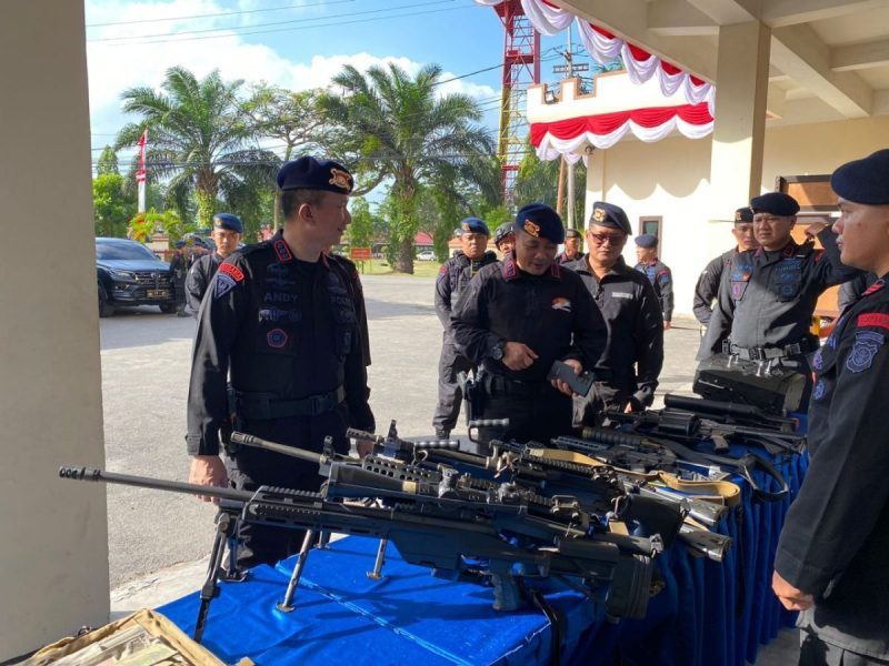 BALIKPAPAN (Beritakeadilan, Kalimantan Timur) – Komandan Satuan Brimob Polda Kaltim Kombes Pol. Andy Rifai, S.I.K., M.H. memimpin apel pengecekan perlengkapan Almatsus serta kesiapsiagaan personel di lapangan M. Yasin Satbrimob Polda Kaltim. Rabu, (9/8/23).