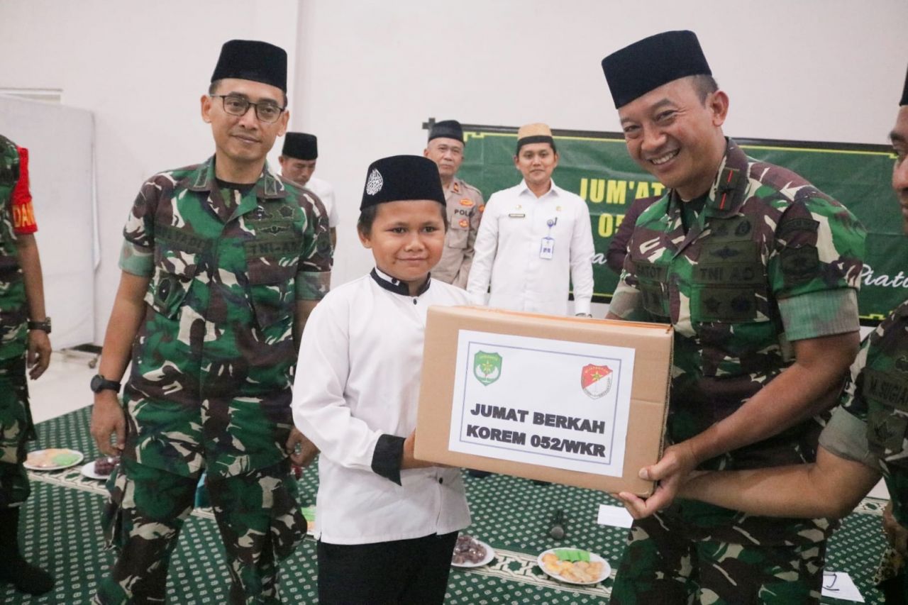 “Jumat berkah sudah menjadi program dari Korem 052/Wkr dan ini adalah cara kami agar bisa berkenalan dan bertemu lebih dekat dengan anak anak asuhan pondok pesantren yang ada diwilayah korem 052/Wkr. Kami mohon maaf bila apa yang kami berikan kurang memadai mengingat Darqo merupakan pondok pesantren yang megah dan besar.”pintanya