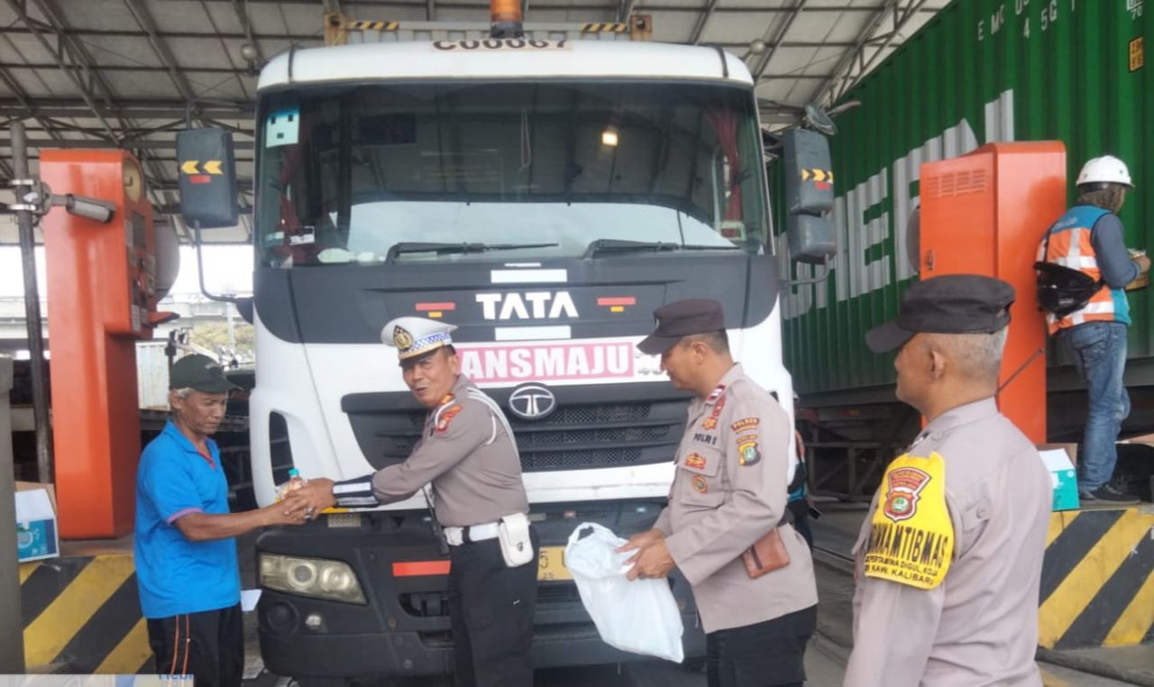 Kanitlantas Polsek Kawasan Kali Baru Polres Pelabuhan Tanjung Priok bersama Bhabinkamtibmas melakukan pembagian snack dan air mineral kepada para supir truk trailer yang memuat kontainer di Common Gate NPCT I yang sedang menunggu antrean di gate in MTI sekaligus memberikan imbauan kamtibmas kepada para sopir bahwa mulai tanggal 1 Februari 2025 pembayaran pas truk masuk di Common Gate NPCT 1 menggunakan kartu STID (Single Truck Identificasion Data) sehingga mengalami penambahan waktu untuk masuk dan antrian panjang truk trailer karena diberlakukannya sistem baru tersebut.