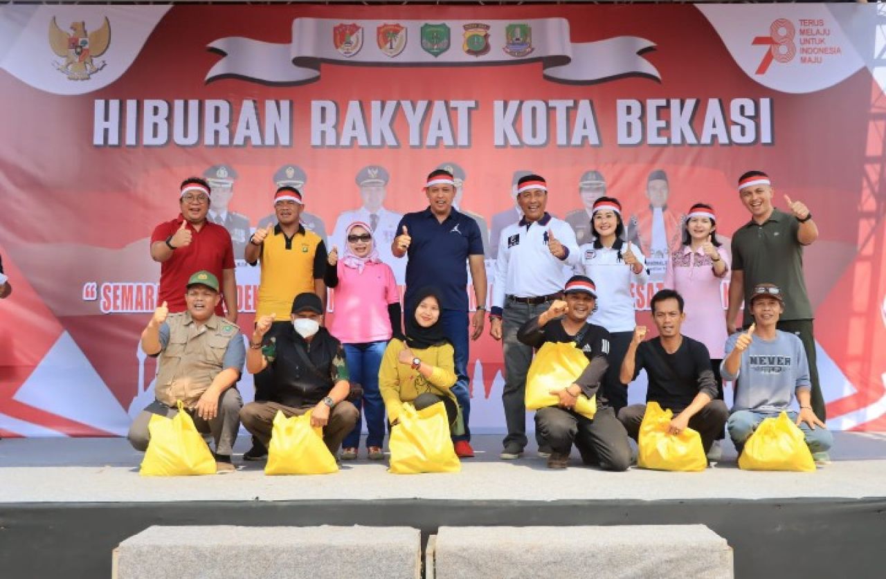 Sebelum acara Hiburan rakyat Kota Bekasi berkahir, kegiatan ditutup dengan pembagian paket bantuan sembako kepada warga secara simbolis dan Foto bersama.