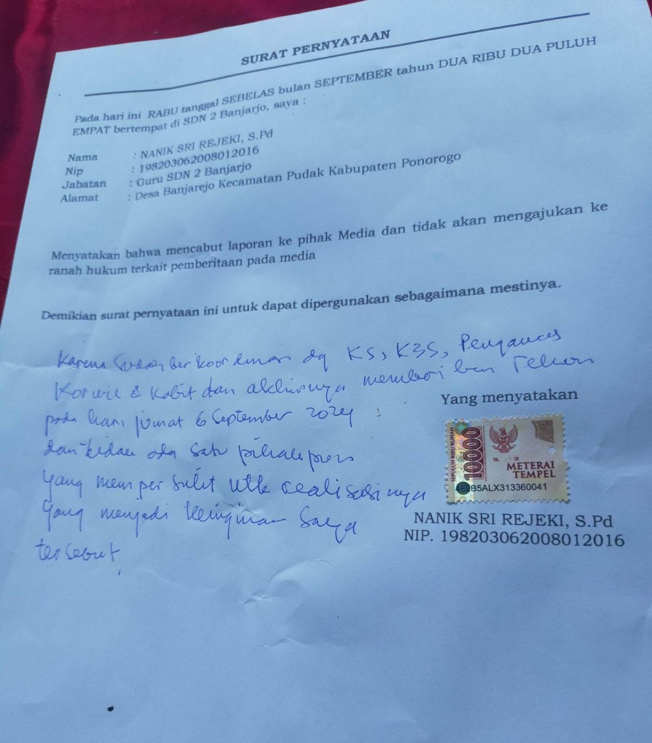 Sutriono bersyukur Edy Wahono, Suroto, Nanik bisa ketemu sekaligus menghadap Kepala Dinas Pendidikan Kabupaten Ponorogo. “Kepala Dinas tadi sudah membahas, intinya untuk segera diselesaikan secara kekeluargaan. Bahkan Edy Wahono bersama Suroto sudah menyiapkan selembar kertas Surat Pernyataan dengan isi Nanik sudah mencabut pemberitaan www.beritakeadilan.com. “Namun karena isi surat pernyataan tersebut yang membuat bukan Nanik sendiri, akhirnya Nanik tidak mau tanda tangan dihadapan Kepala Dinas, bahkan oleh Kepala dinas disarankan untuk penyelesaian secara kekeluargaan tanpa ada campur tangan pihak ketiga seperti Media, LSM, LBH,” jelas Sutriono.