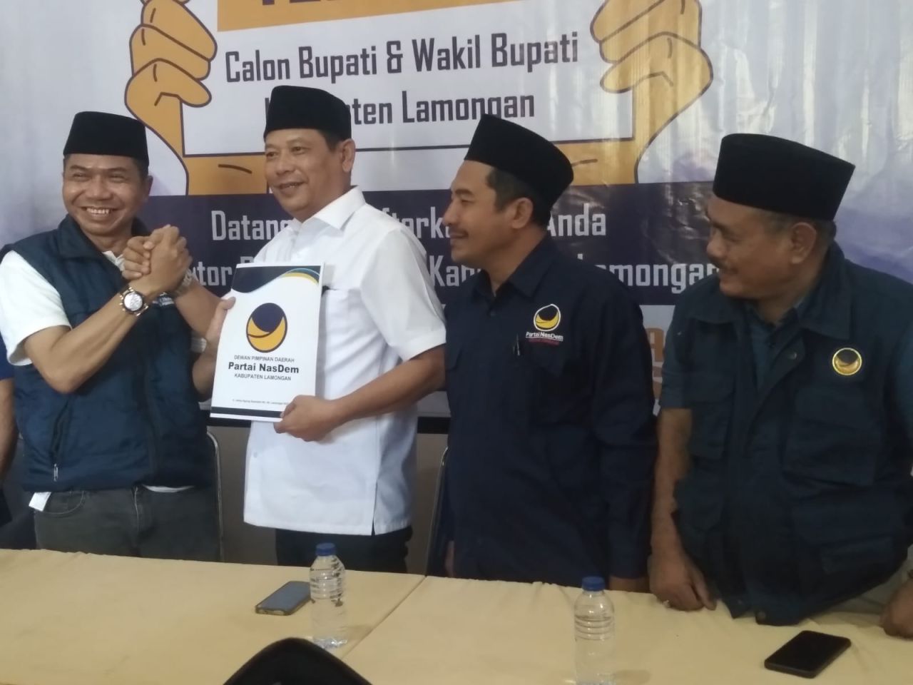 Datang bersama rombongan, pria yang menjabat Ketua DPRD Lamongan juga Ketua DPC PKB Lamongan itu hadir di kantor DPD NasDem Lamongan menggunakan baju lengan pendek putih serta kopyah hitam.