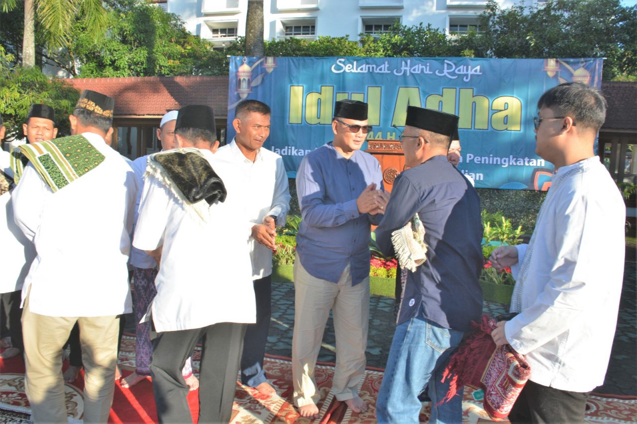 Prof. DR. H. Rosihan Anwar, M.AG. pada Khotbahnya menyampaikan tentang makna Idul Adha yang mengajarkan tentang keberanian berkurban untuk membantu orang lain yang membutuhkan.