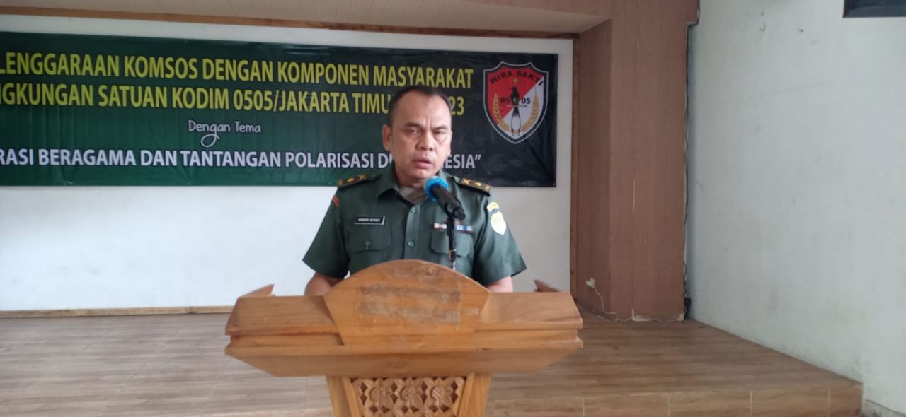Dandim 0505/Jakarta timur Letkol Arm Suyikno,S,Sis, M.Si dalam sambutannya yang dibacakan Pasiter Mayor Inf Nawawi Affandi mengatakan, dengan mengangkat tema ‘Moderas Beragama dan Tantangan Polarisasi di Indonesia ” kegiatan Komsos ini sebagai ajang silaturahmi antara TNI dengan komponen masyarakat di wilayah Jakarta timur. “Selain itu dari kegiatan ini akan terjalin tali silaturahmi antara Kodim 0505/JT dengan semua unsur, baik Polres Metro Jakarta timur, Pemda dan Komponen Masyarakat, guna membangun masyarakat Indonesia yang berkarakter dengan berlandaskan wawasan kebangsaan dalam rangka mewujudkan persatuan dan kesatuan Bangsa,” ucapnya.