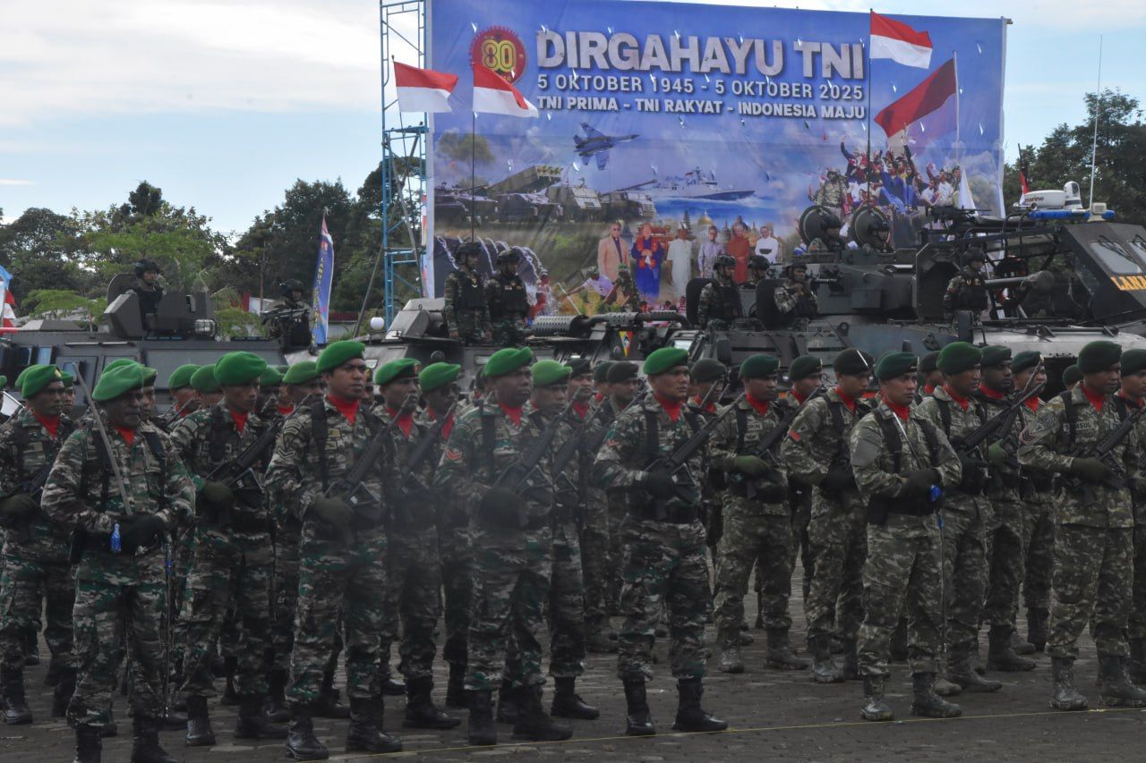 KABUPATEN MIMIKA (Beritakeadilan.com, Papua) – Bertempat di Lapangan Apel Kantor Pusat Pemerintahan Kab. Mimika, Jl. Cenderawasih, Kel. Karang Senang, Sp.3, Distrik Kuala Kencana, Kodim 1710/Mimika bersama satuan TNI se-Garnisun Timika menggelar upacara peringatan Hari Ulang Tahun (HUT) ke-80 Tentara Nasional Indonesia (TNI) dengan Tema “TNI Prima, TNI Rakyat, Indonesia Maju” dan Inspektur Upacara Letkol Inf Indra Luthfi Wibisono, S.E, Danyonif 754/ENK, Minggu (05/10/2025).
