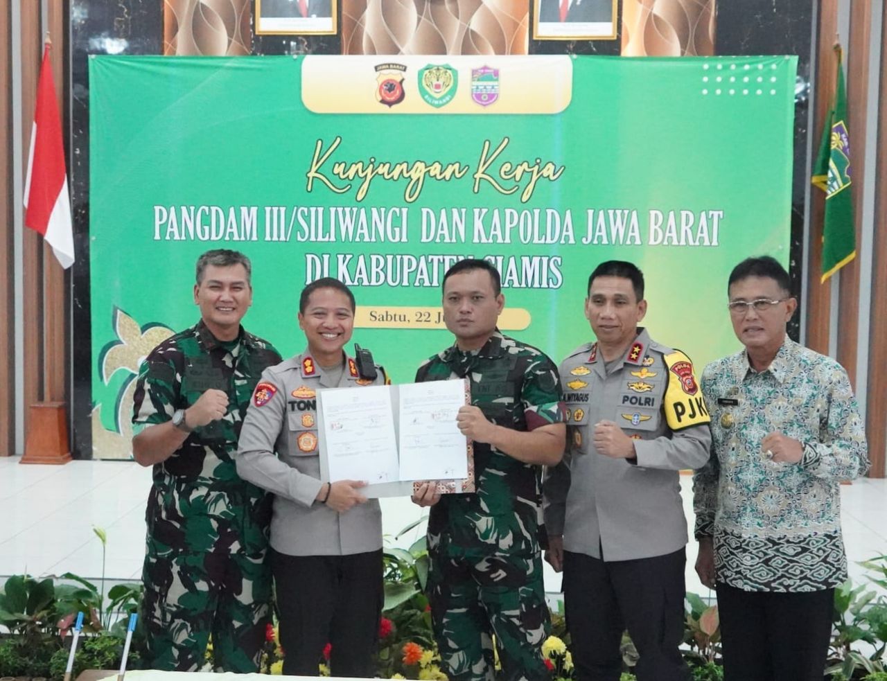 Pada kesempatan itu Pangdam dan Kapolda menyaksikan penandatanganan 7 Perjanjian Kerja Sama (PKS). Pertama, PKS antara Kodim 0613/Ciamis dengan Pemda dan Polres Ciamis tentang Pengelolaan Sampah Berbasis Pemberdayaan Masyarakat. Kedua, PKS antara Koperasi Kartika Galuh Ciamis dengan Primer Koperasi Kepolisian Resor Banjar tentang Pemasaran Pupuk Cair Formula Bios 44 DC dan Kompor Biomasss Burner. Ketiga, PKS antara Kodim 0613/Ciamis dengan Pengadilan Agama tentang Istbat Nikah.
