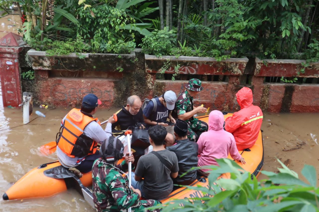 Personel dari Koramil 04/Kebayoran Lama dikerahkan untuk mengevakuasi warga yang masih terjebak di rumah mereka.