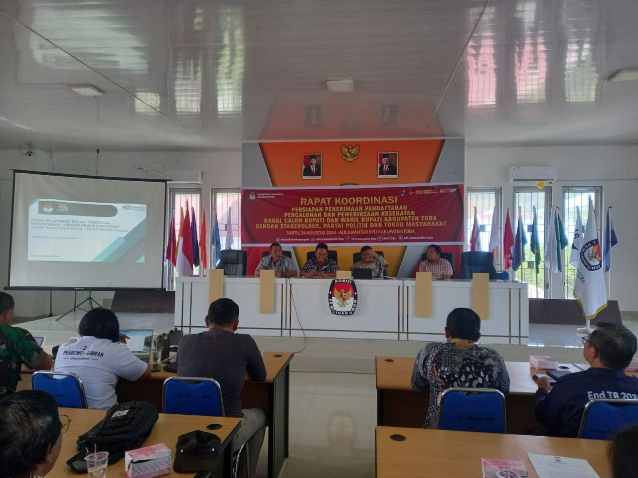 Komisioner KPU Kabupaten Toba Ridwan Marpaung mengatakan bahwa Kegiatan Rapat dilaksanakan dalam Rangka Persiapan dalam Teknis Pelaksanaan Penerimaan Pendaftaran Pencalonan dan Pemeriksaan Kesehatan Bakal Calon Bupati dan Wakil Bupati Kabupaten Toba pada Pilkada Tahun 2024 di wilayah Kabupaten Toba.