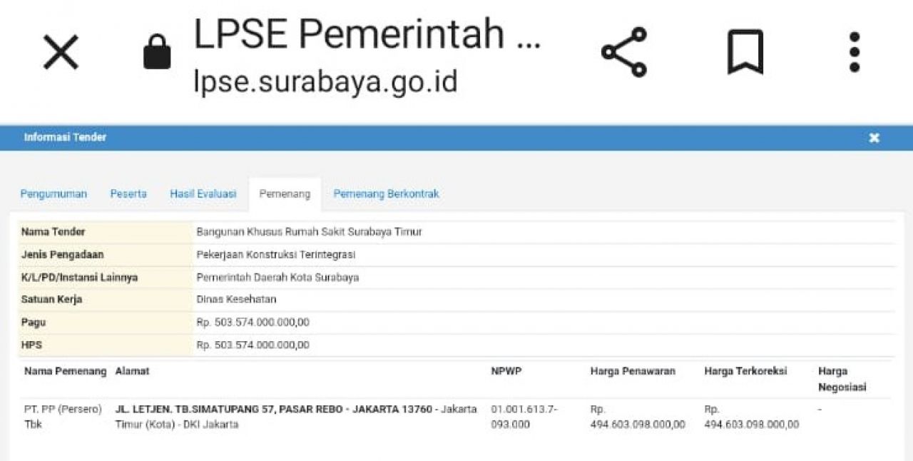 KOTA SURABAYA (Beritakeadilan, Jawa Timur)-Polemik tender pembangunan Rumah Sakit (RS) Surabaya Timur senilai Rp 503.574.000.000,00 yang dimenangkan oleh PT. Pembangunan Perumahan (PP) dengan harga penawaran Rp 494.603.098.000,00 ramai menjadi perbincangan warga Surabaya, manakala PT. PP mengalahkan para pesaingnya, diantaranya PT. Waskita Karya dengan harga penawaran lebih rendah yakni Rp 476.884.578.000,00.
