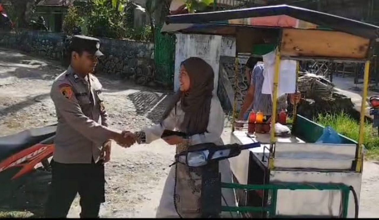 Melihat hal itu, Bhabinkamtibmas dengan tegur sapa dan penuh Humanis menanyakan dan memberikan bantuan kepada ibu tersebut dengan mendorong kendaraan tersebut sampai hidup kembali, sehingga ibu tersebut bisa kembali aktivitas jualan.