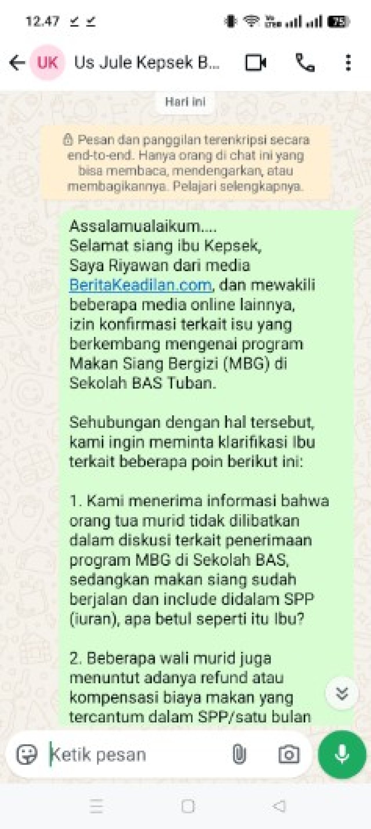 Ironisnya, pihak sekolah belum memberikan klarifikasi resmi. Orang yang disebut sebagai kepala sekolah Yayasan BAS Tuban, Us Jule, saat dihubungi awak media melalui pesan WhatsApp, tidak memberikan tanggapan hingga berita ini diturunkan.