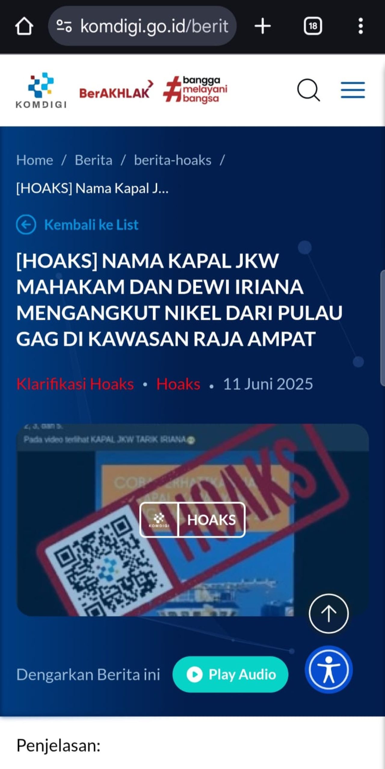 “Respons cepat dan berbasis bukti adalah vaksin terbaik melawan hoaks,” ujarnya. Kasus lain adalah hoaks JKW-Mahakam, yang mengaitkan kapal tunda dan tongkang dengan isu tambang nikel di Raja Ampat serta menuding pemiliknya adalah mantan presiden. Fakta sesungguhnya menunjukkan kapal itu milik perusahaan publik di Kalimantan.
