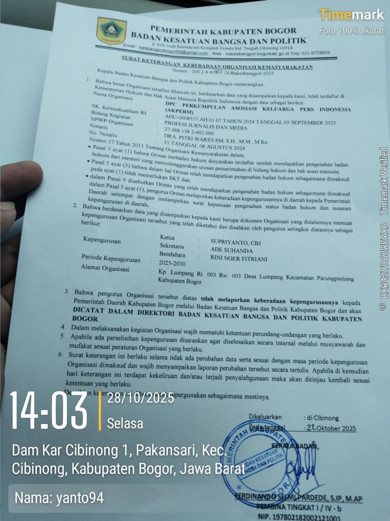 Akpersi DPC Bogor Resmi Terdaftar di Kesbangpol Kabupaten Bogor