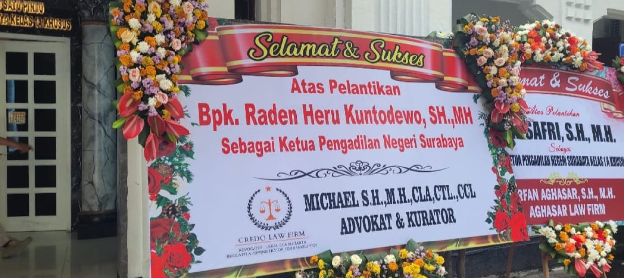 Yang menjadi sorotan, salah satu karangan bunga milik seorang advokat terlihat ditempatkan di posisi paling strategis, tepat di depan pintu masuk gedung. Karangan bunga tersebut dikirim oleh advokat sekaligus kurator, Michael SH., MH., CLA., CTL., CCL., yang turut memberikan ucapan selamat atas pelantikan pimpinan baru.