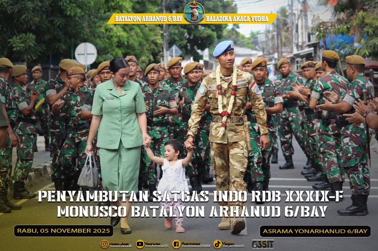 JAKARTA UTARA (Beritakeadilan.com, DK Jakarta) - Suasana haru dan bangga menyelimuti Asrama Arhanud 6/BAY pada Minggu (5/10/2025), saat Satuan Tugas (Satgas) Indo RDB XXXIX-F MONUSCO Batalyon Arhanud 6/BAY tiba kembali di tanah air setelah menuntaskan misi perdamaian PBB di Republik Demokratik Kongo.