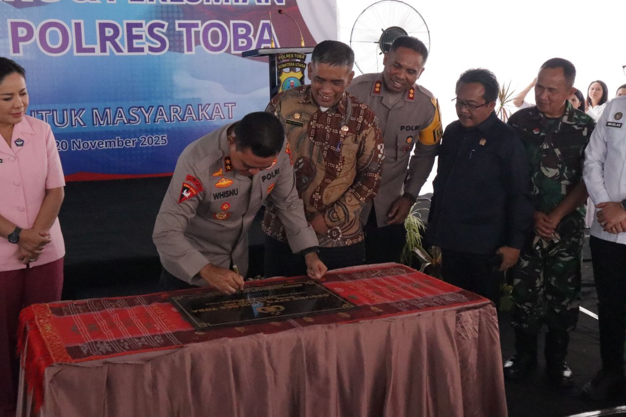 Selanjutnya, Kapolda bersama Ketua Bhayangkari Daerah Sumatera Utara, Ny. Mona Whisnu Hermawan serahkan bantuan sosial secara simbolik kepada para pelajar tingkat SMP dan SMA serta relawan SPPG Polres Toba. Sebagai tanda diresmikannya operasional SPPG Polres Toba, Kapolda Sumut, Irjen Pol Wisnu lakukan penandatanganan prasasti sekaligus pemotongan pita disaksikan Sekretaris Daerah dan Forkopimda Kabupaten Toba dan diakhiri dengan peninjauan lokasi operasional SPPG.
