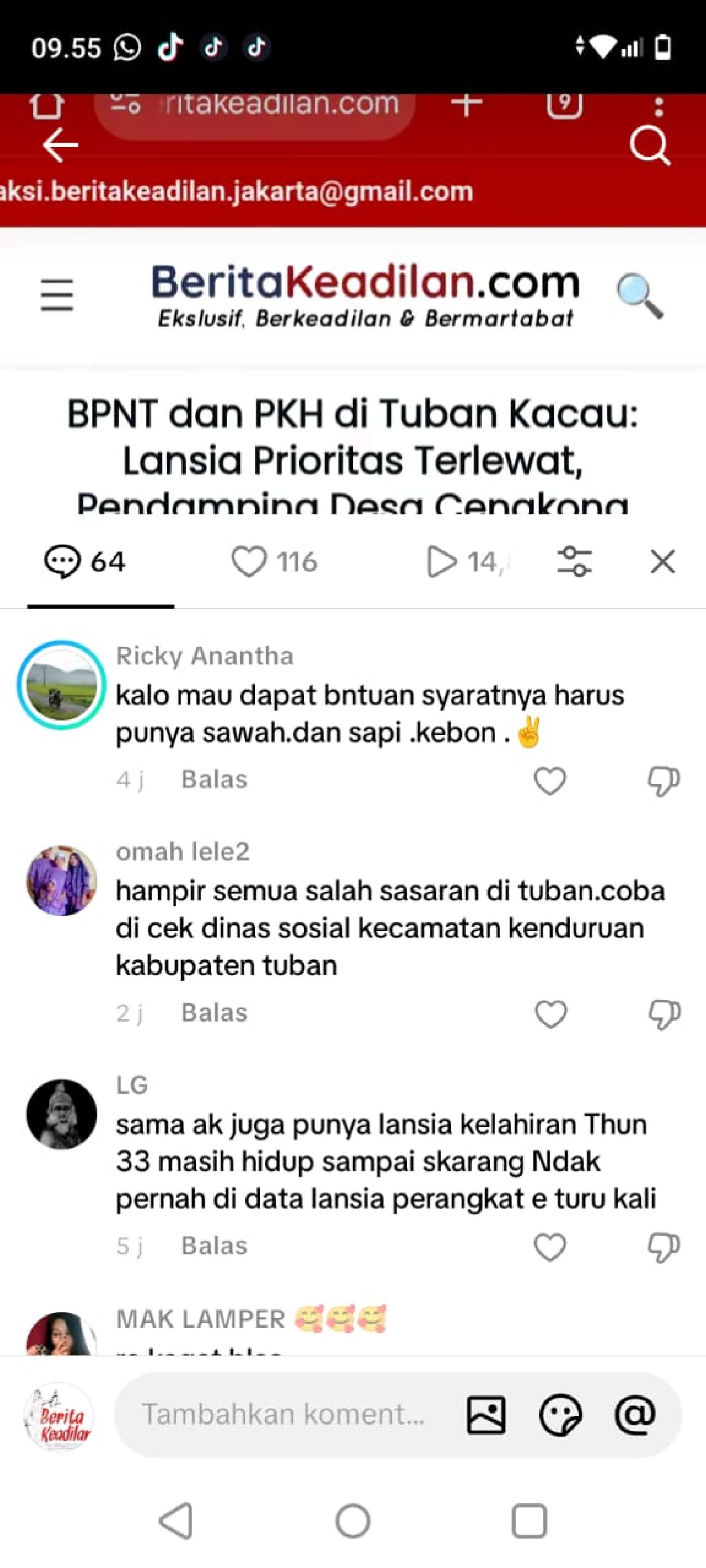 KABUPATEN TUBAN (Beritakeadilan.com, Jawa Timur)-Polemik dugaan ketidaktepatan penyaluran Bantuan Pangan Non Tunai (BPNT) dan Program Keluarga Harapan (PKH) di Desa Cengkong, Kecamatan Parengan, Kabupaten Tuban, kini meluas menjadi sorotan nasional setelah video dan komentar mengenai kasus ini menjadi viral di platform TikTok pada Senin (8/12/2025).